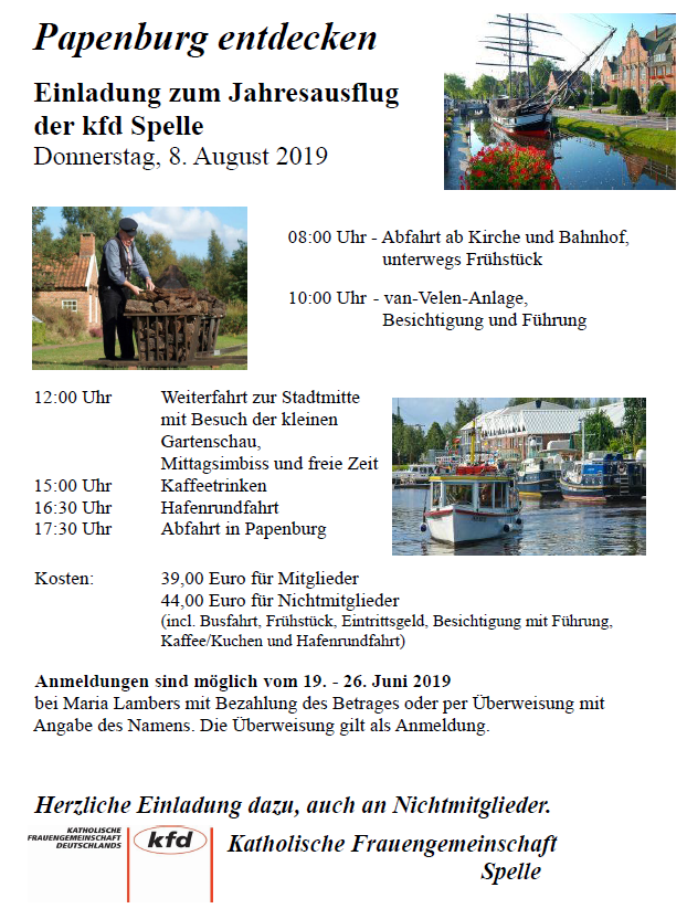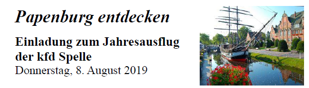 Der diesjährige Jahresausflug der kfd Spelle findet am Donnerstag, den 08. August 2019, statt. Unter dem Motto „Papenburg entdecken“ ist ein vielfältiges Programm zusammengestellt worden.