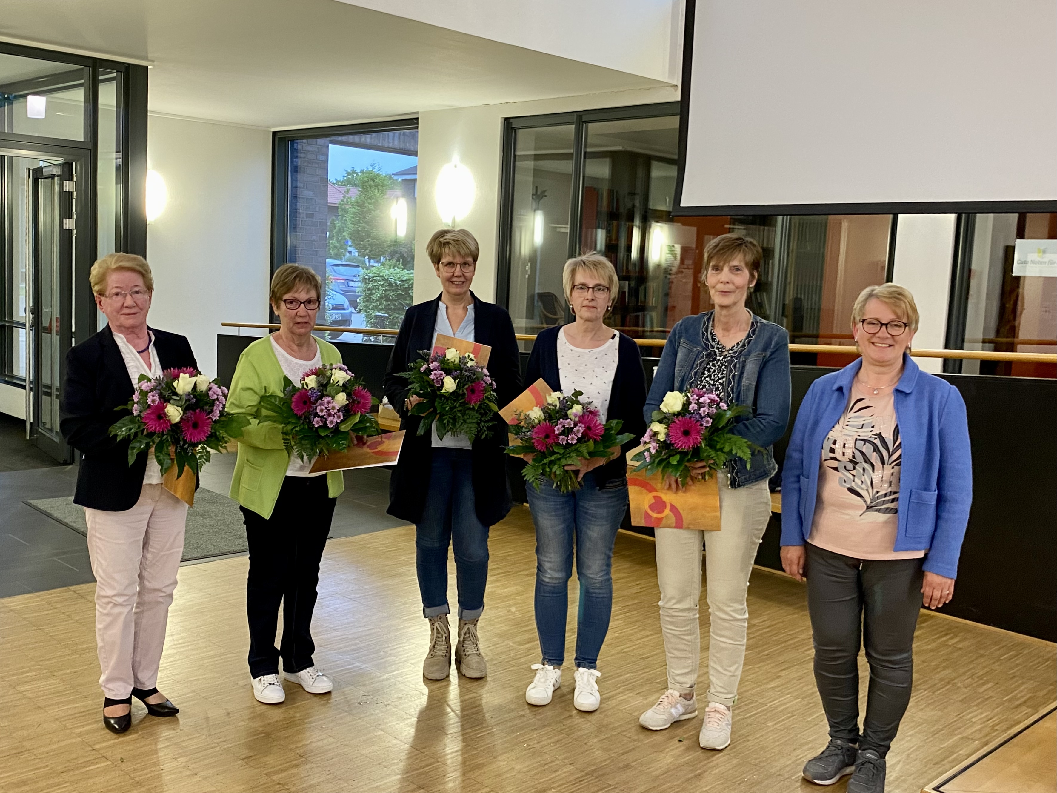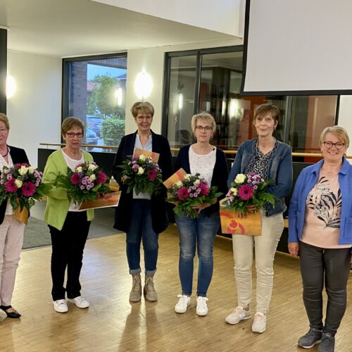 Im Anschluss erfolgte die Ehrung der Mitarbeiterinnen. Für 35 Jahre aktive Unterstützung und Mitarbeit wurden Klärchen Wolters und Maria Thünemann geehrt, für 30 Jahre Marlies Knieper und für 20 Jahre Elsbeth Dagge sowie Elisabeth Sandfort. Auch an dieser Stelle möchten wir nochmals herzlich für euer langjähriges Engagement danken. Des Weiteren konnte ein neues Mitglied in der kfd begrüßt werden.