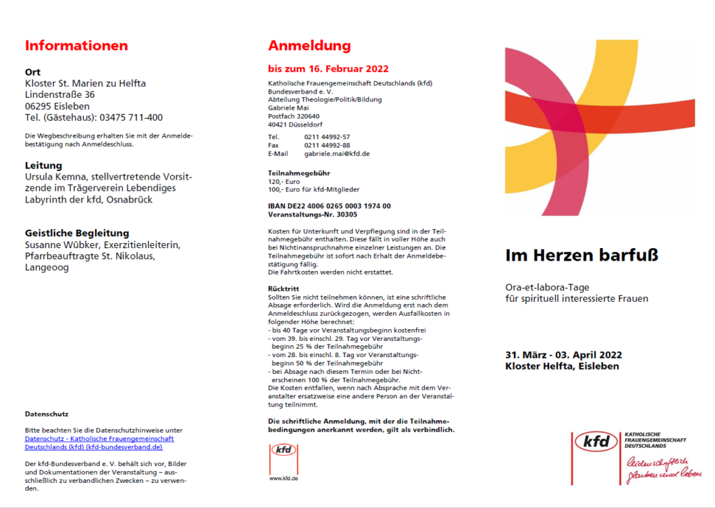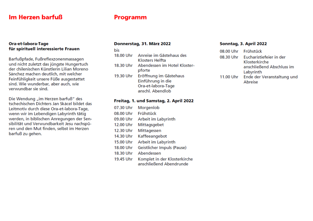 Barfußpfade, Fußreflexzonenmassagen und nicht zuletzt das jüngste Hungertuch der chilenischen Künstlerin Lilian Moreno Sánchez machen deutlich, mit welcher Feinfühligkeit unsere Füße ausgestattet sind. Wie wunderbar, aber auch, wie verwundbar sie sind. Die Wendung „im Herzen barfuß“ des tschechischen Dichters Jan Skácel bildet das Leitmotiv durch diese Ora-et-labora-Tage, wenn wir im Lebendigen Labyrinth tätig werden, in biblischen Anregungen der Sensibilität und Verwundbarkeit Jesu nachspüren und den Mut finden, selbst im Herzen barfuß zu gehen.