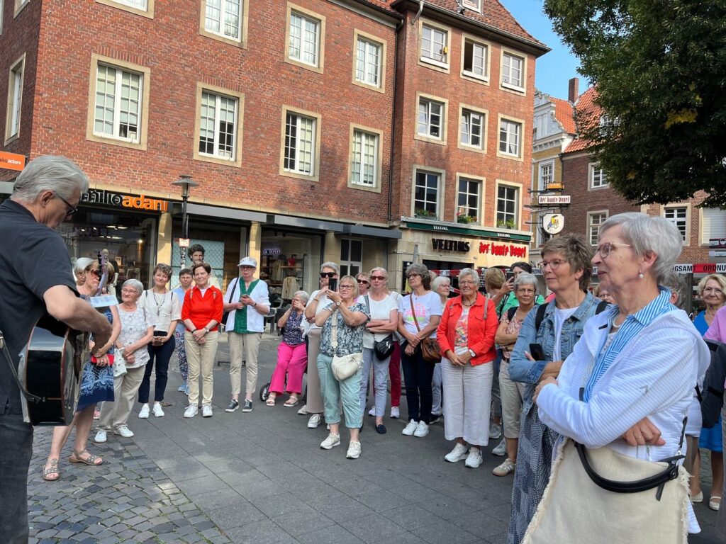 Gut gelaunt starteten viele kfd Frauen morgens in Spelle. Nach einer kurzen Kaffeepause mit netten Gesprächen am Banjo in Steinfurt ging es gut gestärkt weiter nach Münster.  Am Erbdrostenhof begrüßte uns Clemens Homann zu einer musikalischen Stadtführung. Mit eigenen Texten, die er auf sehr unterhaltsame Weise mit der Gitarre begleitete, zeigte er uns die wichtigsten Sehenswürdigkeiten wie z.B. den Erbdrostenhof, die Klemenskirche, die Einkaufsstraße, das Picasssomuseum, das Landesmuseum, die Lambertikirche und das Rathaus. Nach diesem Überblick erkundeten wir auf eigene Faust oder in kleinen Gruppen die Stadt und stürzten uns bei sonnigem Wetter ins samstägliche Gedränge oder besuchten den Dom. Großes Erstaunen löste der Wochenmarkt aus. Das große Angebot brachte viele zum Staunen.