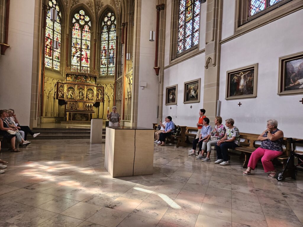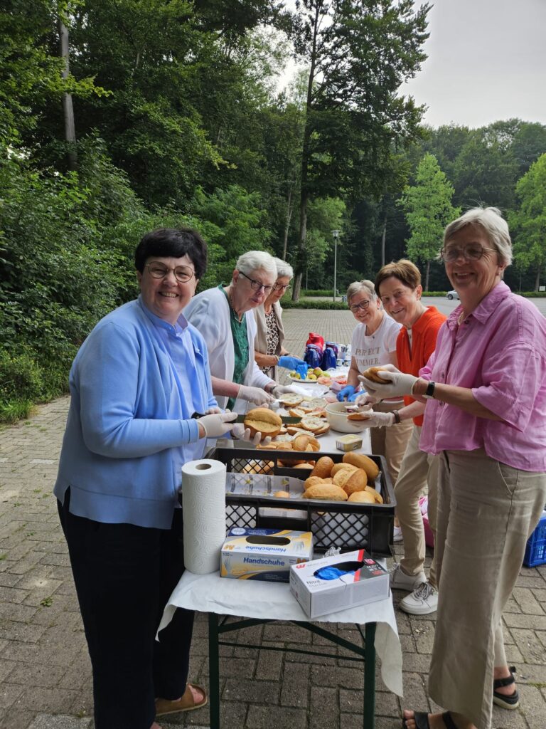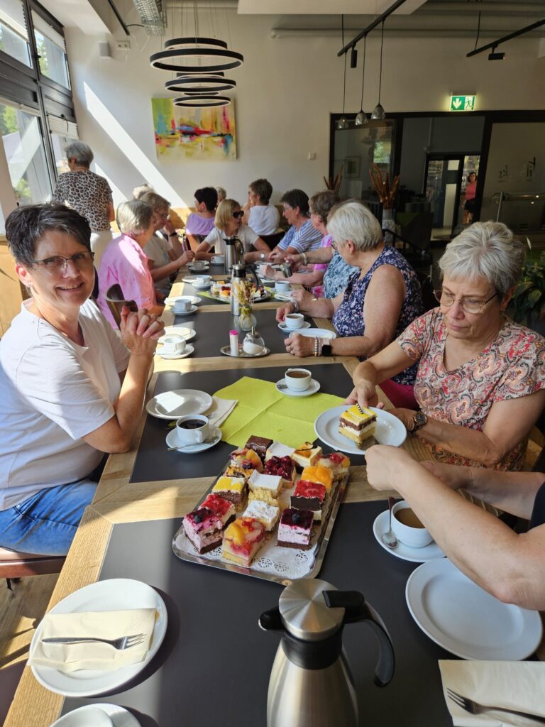 Das nächste Tagesziel war der Stift Tilbeck. Nach einem kurzen religiösen Impuls in der Kapelle gab es bei interessanten Gesprächen Kaffee und leckere Kuchen. Anschließend erkundeten einige Frauen das Gelände auf dem Barfußweg. Wohltuend bei dem warmen Wetter war der Gang durch das Kneipbecken.  Erstaunt waren wir über das große Angebot im Turmantiquariat mit einer sehr großen Auswahl an Büchern, Spielen und Filmen. Dort wurden viele fündig und deckten sich mit unterhaltsamem Lesestoff ein. In dem kleinen Lädchen neben dem Cafe konnte man tolle Produkte erwerben, die in den Werkstätten hergestellt werden. Interessierte Käuferinnen unterstützen so die Arbeit der Menschen mit und ohne Behinderung, die auf dem Gelände leben.