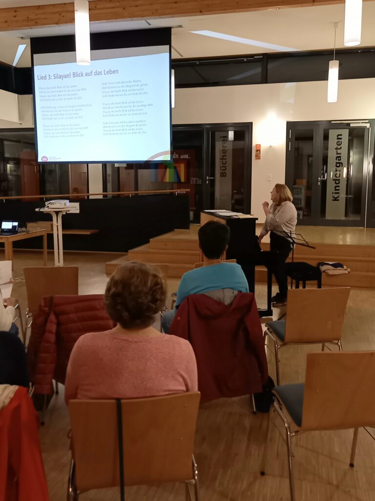 Im Rahmen der Aktionswoche „Runter vom Sofa – rein in die singende Gemeinschaft“ fand am 09. Oktober 2023 ein gemeinsamer Gesangsabend in der Arche statt. Musikalisch wurde das Rudelsingen von Irene Thiemann am Klavier begleitet.