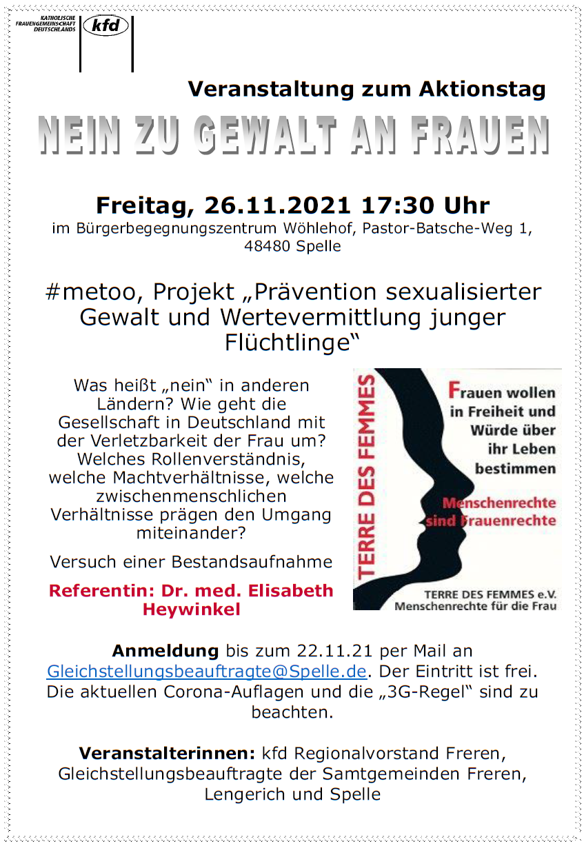 Der Regionalvorstand Freren und die Gleichstellungsbeauftragen der Samtgemeinden Freren, Lengerich und Spelle laden am Freitag, den 26.11.2021, um 17:30 Uhr zur Veranstaltung „Nein zu Gewalt an Frauen“ ein. Die Veranstaltung findet im Bürgerbegegnungszentrum Wöhlehof in Spelle statt.